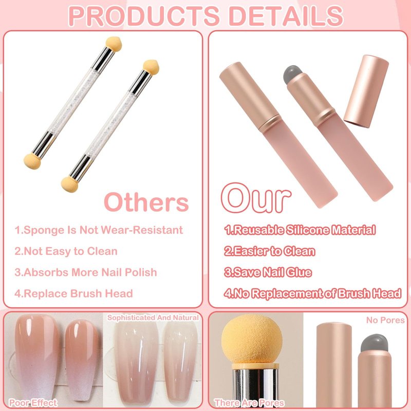 - 【Gradient Manicure Tools】 The brush head of the silicone nail brush adopts a slightly tilted design, which can better touch the nails or skin, apply it more evenly, and create a natural gradient effect. Compared with other sponge nail polish brush tools, our silicone nail tools can pick up the right amount of gel polish without absorbing too much, leaving brush marks and causing waste.