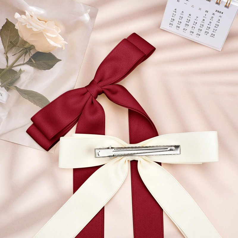 2Pcs Silky Satin Hair Bows for Women Hair Clip Hair Ribbon Ponytail Holder Accessories Slides Metal Clips Hair Bow for Girls Toddlers Teens Kids-Beige/Red