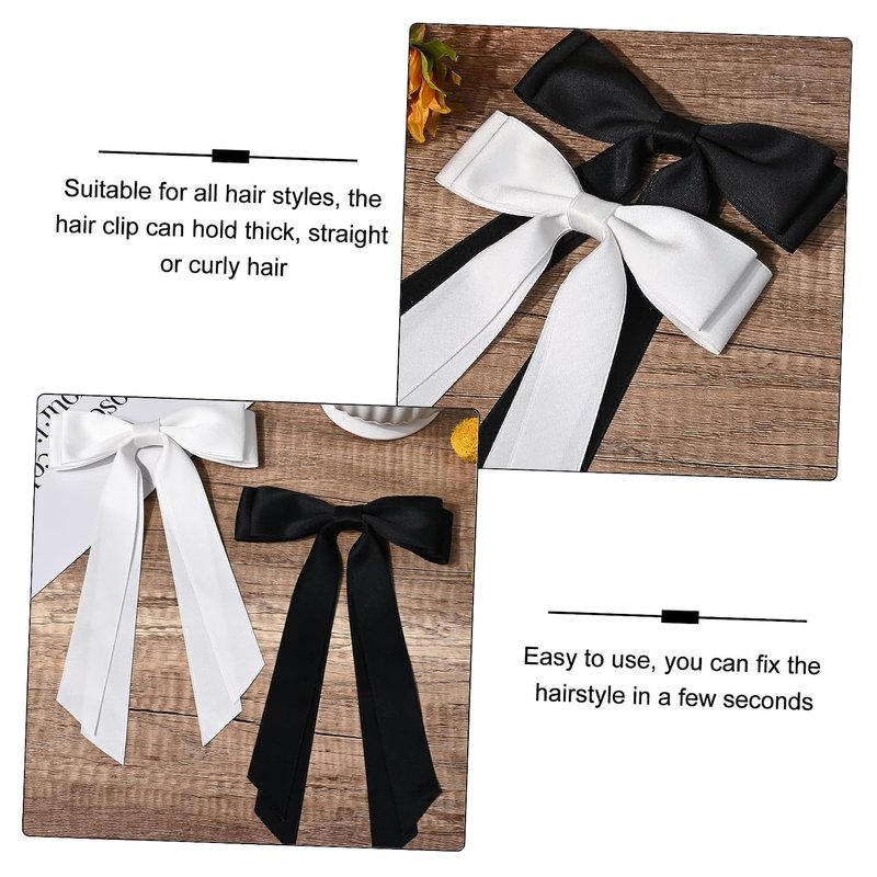 2PCS Silky Satin Hair Bows Ribbon Hair Clips, Fall Alligator Hair Pins, Ponytail Holder Accessories Sides Metal Hair Bow Barrettes Hair Accessories for Women Girls Kids (Black+White)