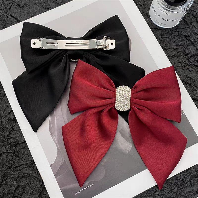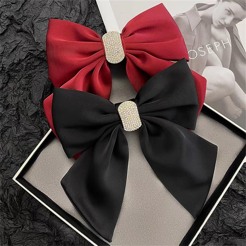 2PCS Silky Satin Rhinestone Hair Bows Hair Clip Hair Ribbon Ponytail Holder Accessories Slides Metal Clips Hair Bow for Women Girls Toddlers (Black+red Rhinestone)