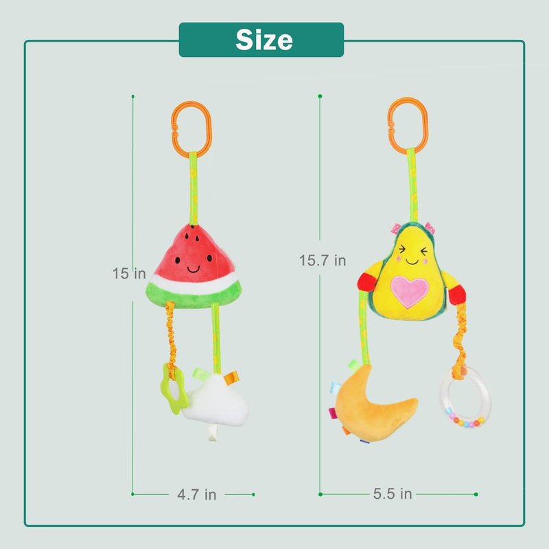 2PCS Soft Plush Hanging Stroller Toys with Teether and Rattles,Newborn Stroller Car Seat Crib Toys Colorful Fruits Sensory Early Development Toy for 0-12 Months Toddlers