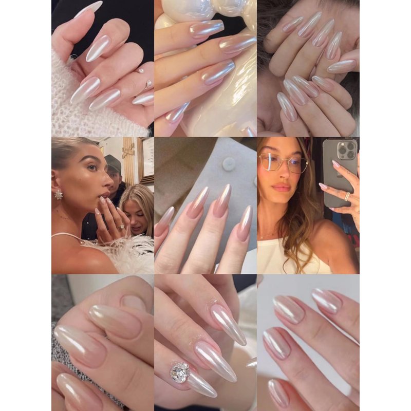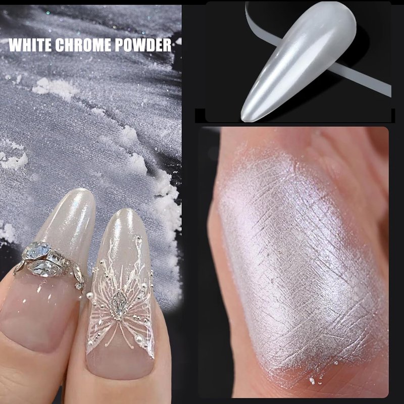 - 2 Boxes Clear Chrome Nail Powder: The white chrome powder for nails set contains 2 boxes moonlight pearl gel chrome powder, 2pcs sponge eyeshadow stick. This pearl chrome nail powder is the latest style of 2024. It will not cover the original color of the nail gel polish, and the glittering shiny is revealed after use.