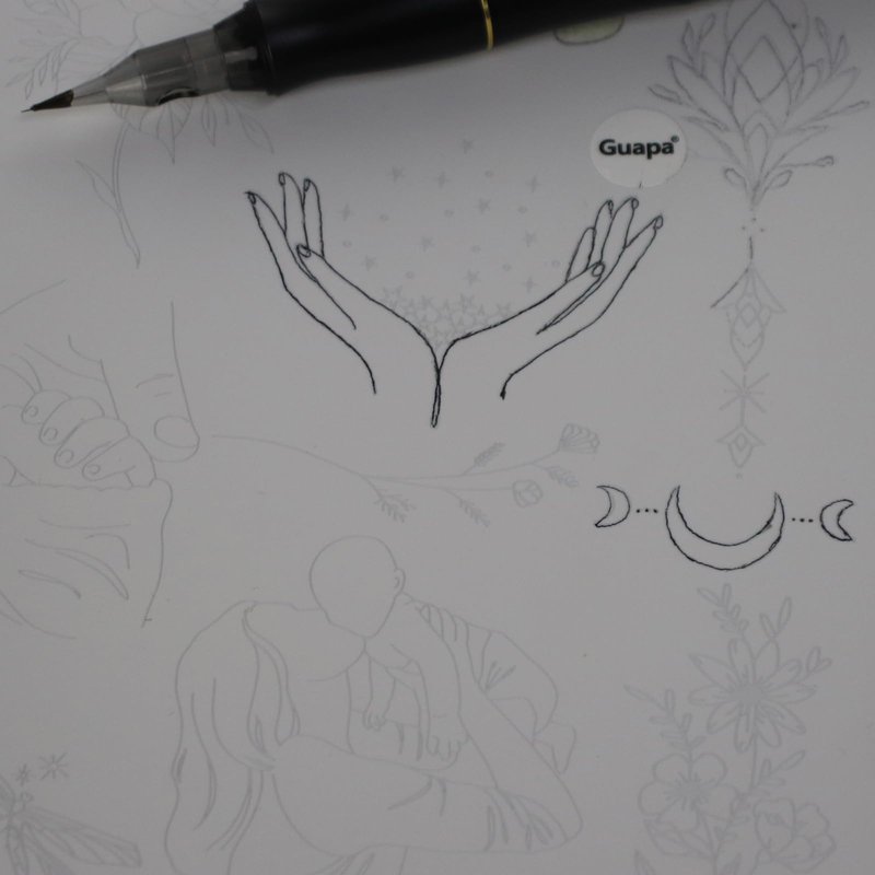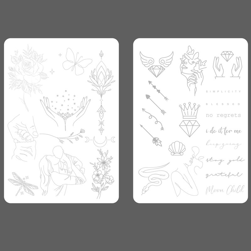 - Minimalist tattoo practice pad Versatile Practice Collection: Elevate your tattooing skills with our Double-Sided Minimalist Tattoo Practice Pad featuring 30 unique stencil designs, including heart arrows, hands,crystal,moon,shell,flowers,words fonts,snake,butterfly and femininity outline.