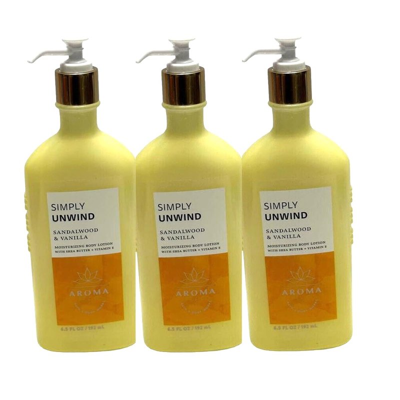 3 AROMA SIMPLY UNWIND SANDALWOOD VANILLA BATH BODY LOTION 6.5 oz
