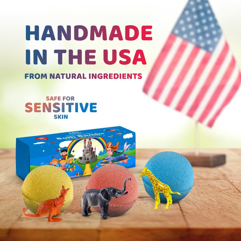 3 Handmade Bath Bombs for Kids with Wild Animals Toys Inside for Boys and Girls – Big Size Toys Natural and Safe Bath Fizzies - Great Gift Set for Boys and Girls