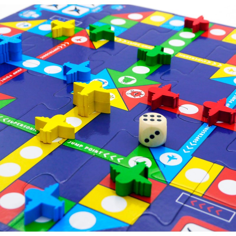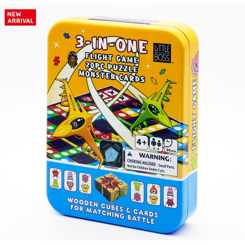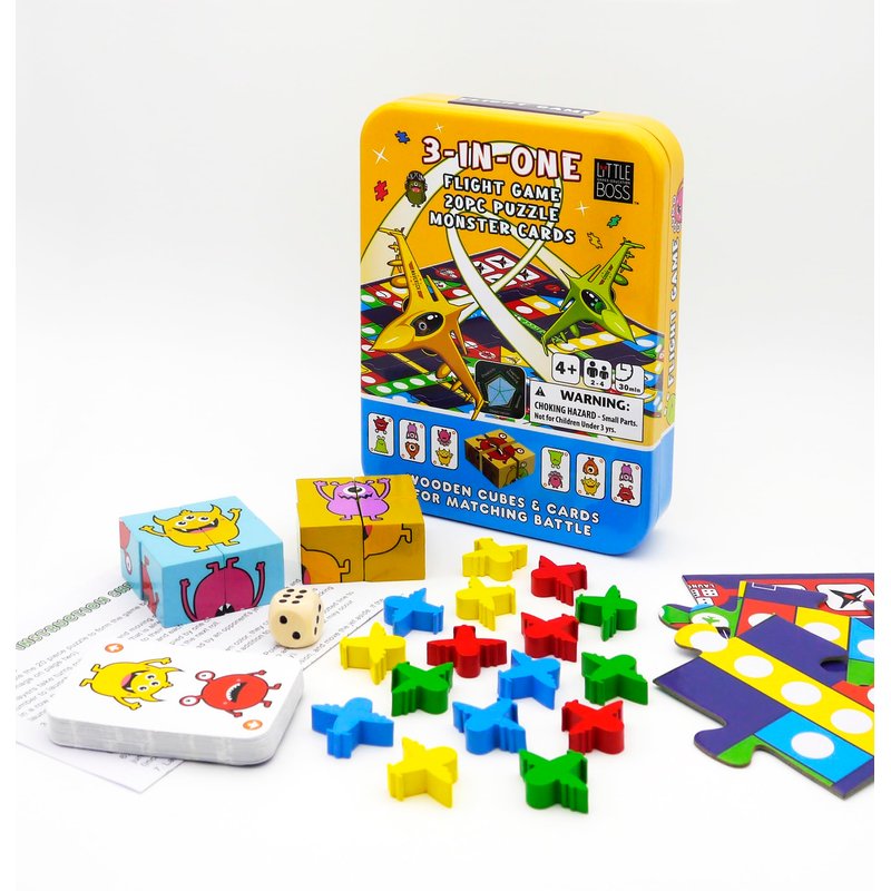 3-in-1 Family Game Set: Flight Game, Puzzle (20 pcs, 2-sided Game Board), Card Game (24 cards) and Board Game for Kids Ages 4-8.