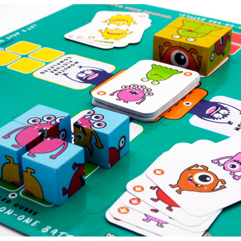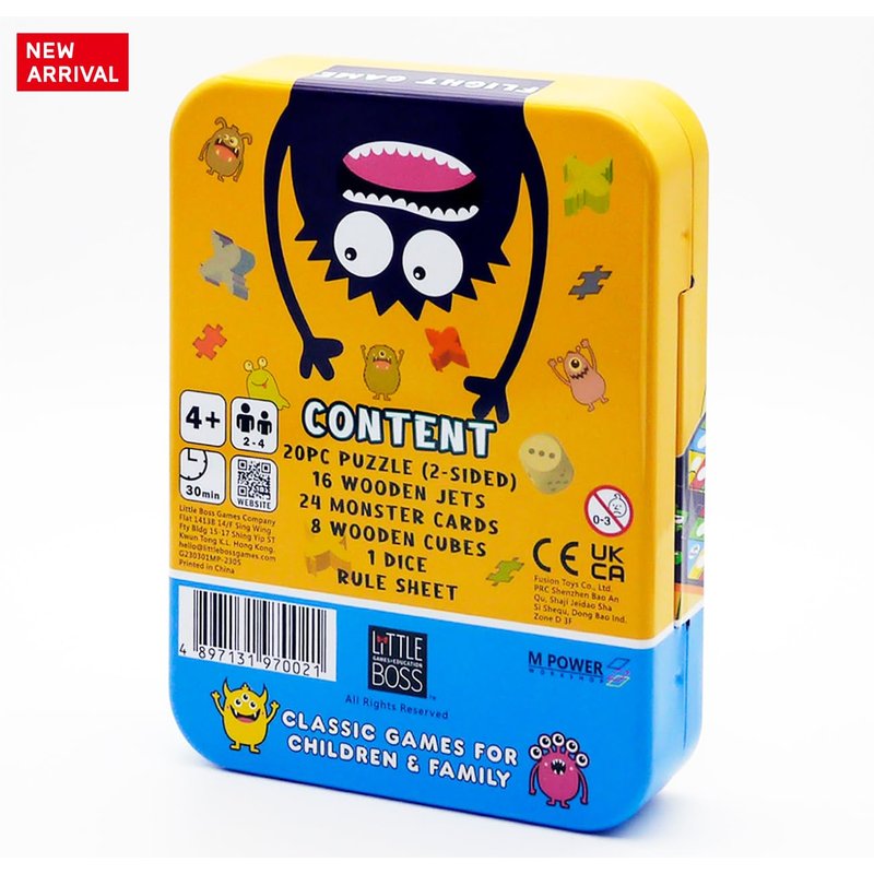 - In the Box: 20 pcs Puzzle (Double-Sided Game Board), 16 Wooden Jets, 24 Monster Cards, 8 Wooden Cubes, 1 Wooden Die, Rule Sheet, Tin Box.