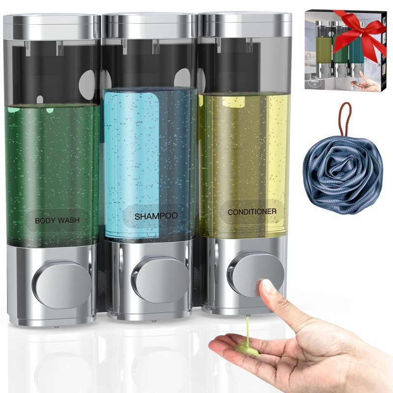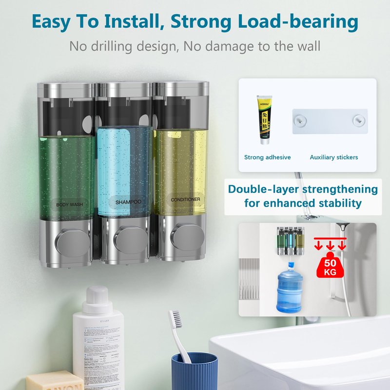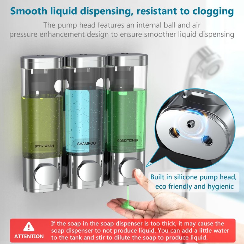 3 in 1 Shower Soap Dispenser, Shampoo and Conditioner Dispenser No Drill, No Leakage soap Dispenser Bathroom, Shower Shampoo Dispenser for Caravans Toilet Bathroom Hotel soap Shower Dispenser Silver