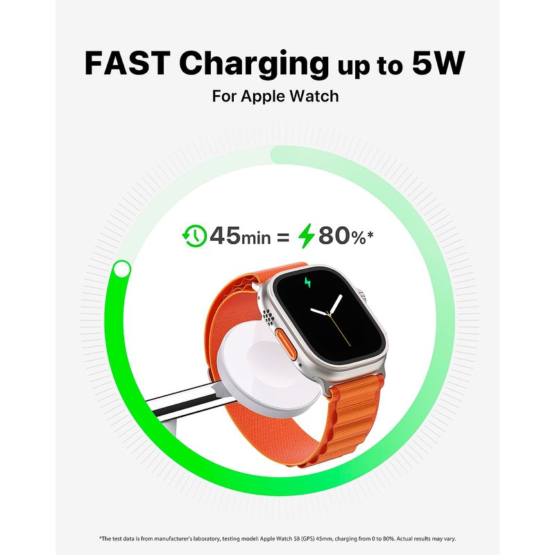 - Fast Charging for Apple Watch: Up to 5W Apple Watch charger. Charge Apple Watch 9 up to 80% in just 45 min—ideal for a fast charge before bed, ensuring it's ready to monitor your sleep all night