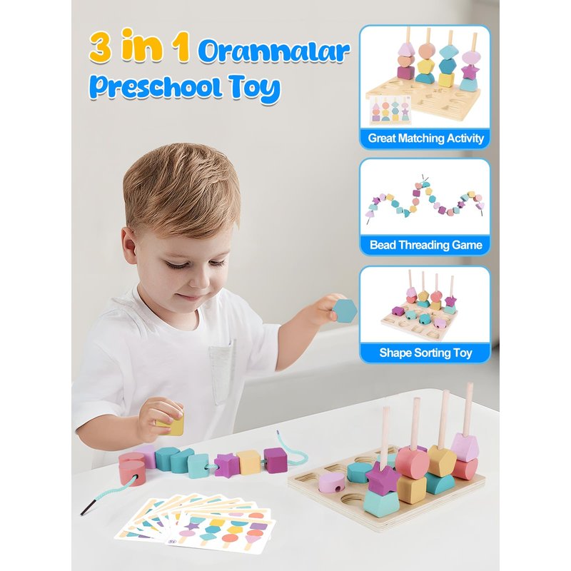 3 in 1Montessori Toy, Shape Sorter Sequencing Block Matching Lacing Beads STEM for Boys Girls 3 4 Year Old Toddler Kids (3 in 1 Edition)