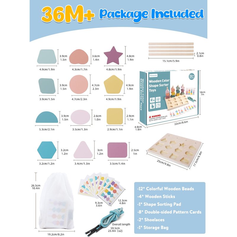 - 【3 in 1 Multifunctional Montessori Toys】This might be the multi-play early education toy you’ve been looking for, With an exquisite packaging, you will receive: 12* colorful wooden beads of various shapes, 4* wooden sticks, 1* shape sorting pad, 8* double-sided pattern cards, 2* ribbons stick shoelaces, 1* storage bag (easy to carry); Very good learning toy - sequencing, pattern matching, Great fun for focusing, lots of Activities to Grow with them! Also, perfect for toddler to enhance hand-eye coordination