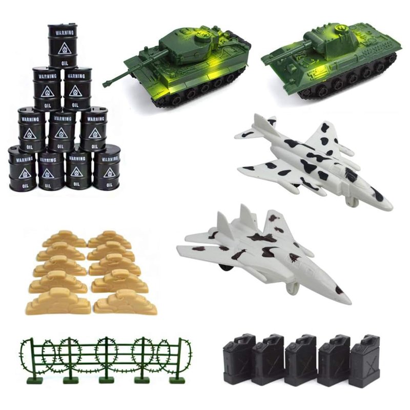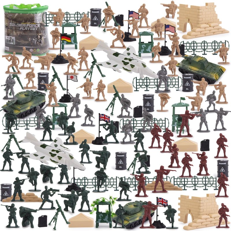 - SUPER VALUE PACK - 100 x Toy Soldier Figures (in 4 different colors, easy for grouping), 150 x Assorted Military Accessory (including tanks, fighters, barriers, watchtowers, barbed wire fences, etc.)