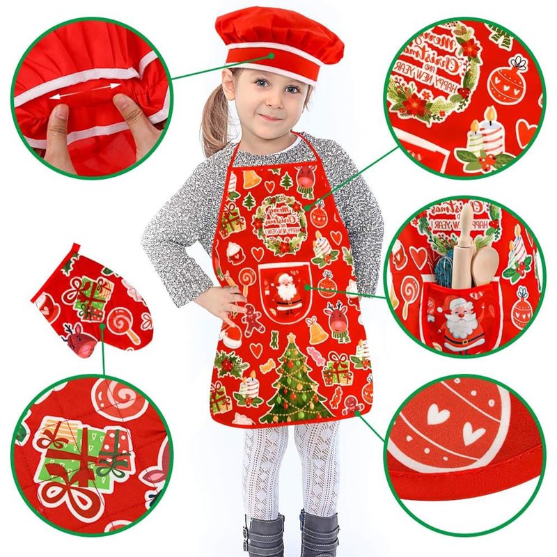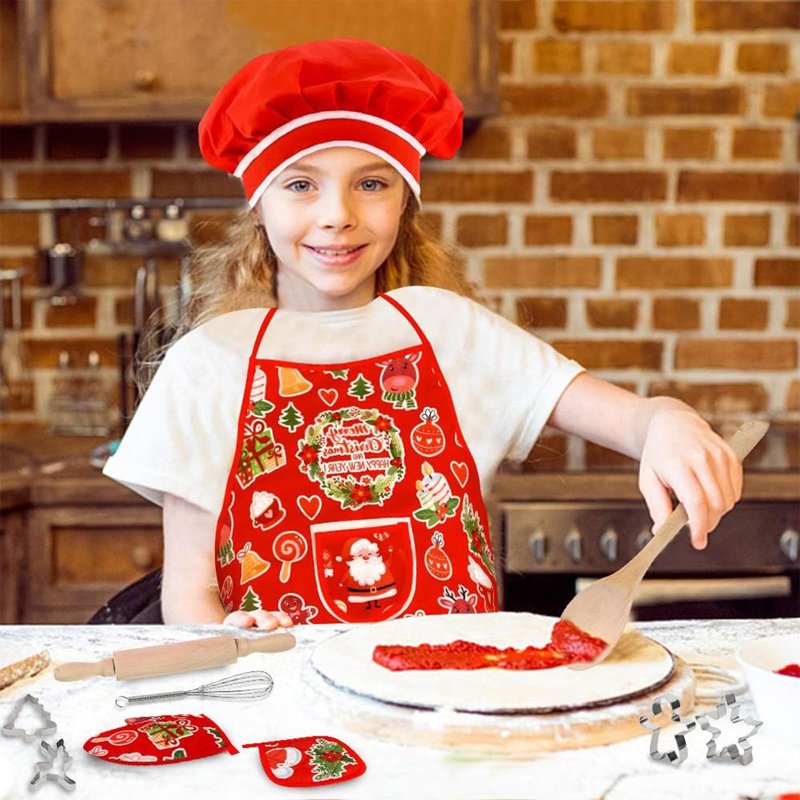 - Cute and Durable - The chef's hat is elastic, suitable for most kids' head circumference. The mitt is impressively thick and 100% heat-resistant, ensuring safety during culinary adventures. Classic Christmas symbols, including reindeer, Santa, Christmas trees, jingle bells, and gingerbread men, adorn the apron, while the cookie cutters feature four charming shapes: Christmas trees, gingerbread men, snowflakes, and reindeer. This delightful set promises parents and kids a fantastic time in the kitchen together.