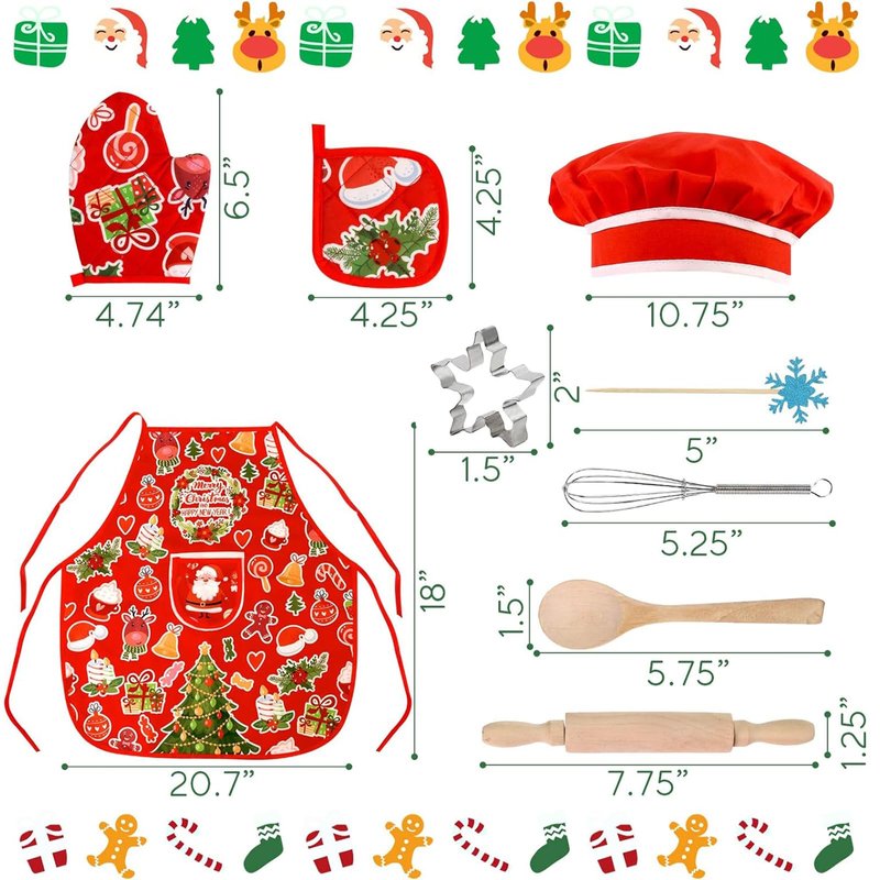 - Unique Design - Our Christmas chef costume set comes beautifully packaged in an exquisite box measuring 11 x 9.4 x 1.25 inches. The kids baking set makes for a perfect Christmas or birthday gift for your little one. The set is adorned with charming Christmas elements on the apron, mitt, mat, and cutters, adding a delightful touch of Christmas atmosphere to your family.