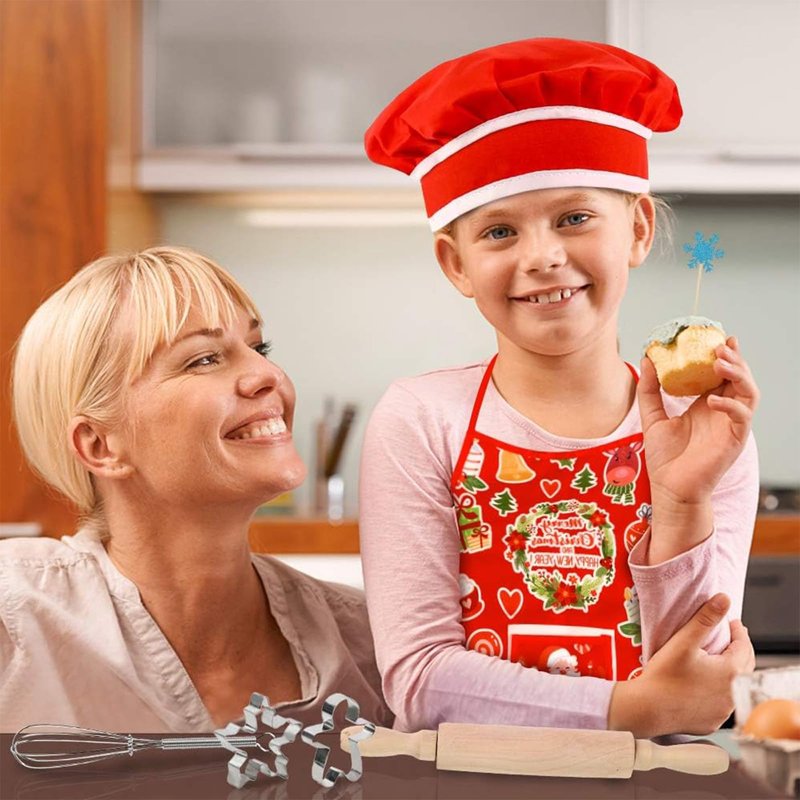 - You Will Get - 21PCS Christmas Theme Toddler Cooking and Baking Set includes: 1PC Apron, 1PC Chef's Hat, 1PC Oven Mitt, 1PC Placemat, 1PC Rolling Pin, 1PC Wooden Spatula, 1PC Egg Whisk, 4PCS Christmas Theme Cookie Cutters, 10PCS Snowflake Cupcake Toppers.