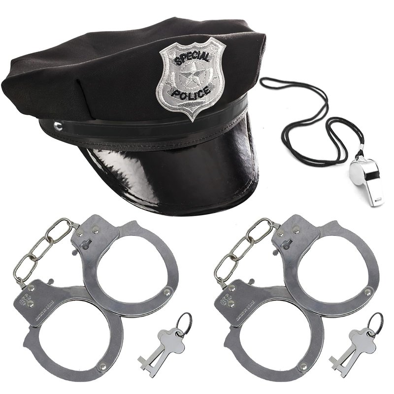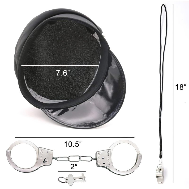 - Durable and Safe - Our toy handcuffs and whistles are constructed from high-grade metal alloy, chrome-plated, and designed to be hefty and sturdy. The toy handcuffs and whistles have a smooth texture, are well-polished, and have no rough edges or discoloration concerns. The police hat is crafted from high-quality materials, offering a skin-friendly and breathable design.