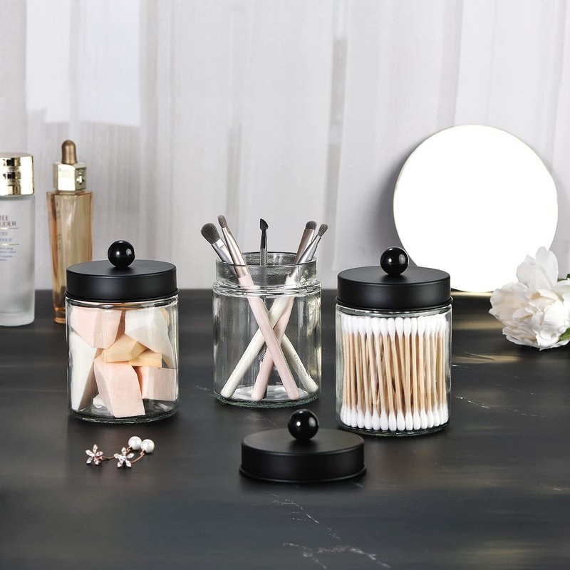 - ❤️ Cute Farmhouse Decor- The apothecary jar set will be a fun and beautiful addition to your powder room, bathroom vanity, makeup table and more;This canister is great for storing and organizing cotton swabs, cosmetic sponges, wedges, bath bombs, balls, salts;Organize your hair accessories, clips, elastic bands, bobby pins, bows and more; Use in home office for paperclips, rubber bands, binder clips, and stamps.
