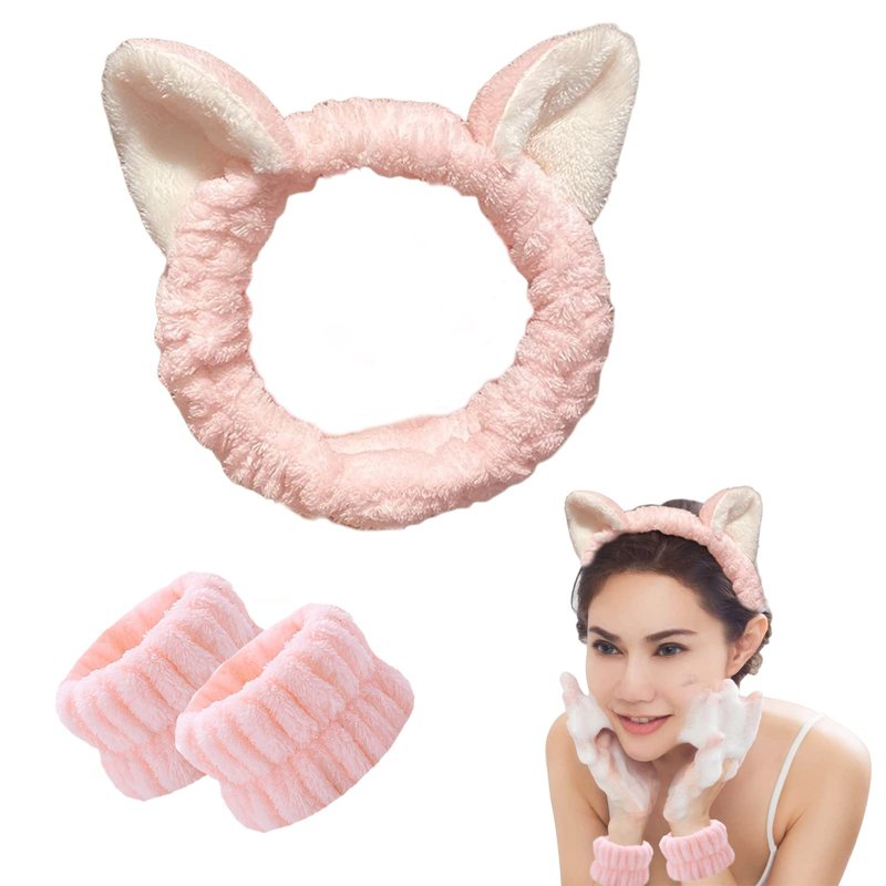3-Pack Cat Ears Spa Headband and Wristband Set, Soft Plush Makeup Skincare Headband Wrist Bands, Cute Cat Ears Face Wash Headband and Towel Wristband Set for Women Girls Washing Face Skin Care(Pink)