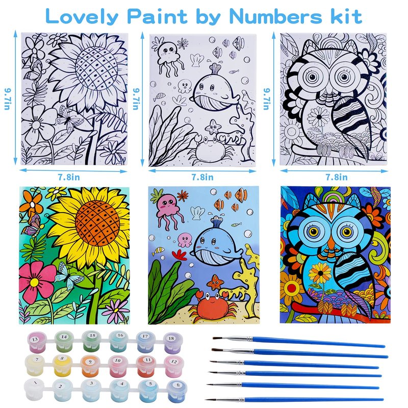 - 【All-inclusive kids paint by number kit】Create your little artist own mesmerizing artwork with our complete arts and craft paint kits. Deluxe paint for kids kit includes 3 style pre-stretched canvas (8x10 inch), 18 acrylic paint pots, 6 paintbrushes, 3 easy-to-follow cards, a pair of arm sleeves and giftable packaging. Oh, and don't forget the fun