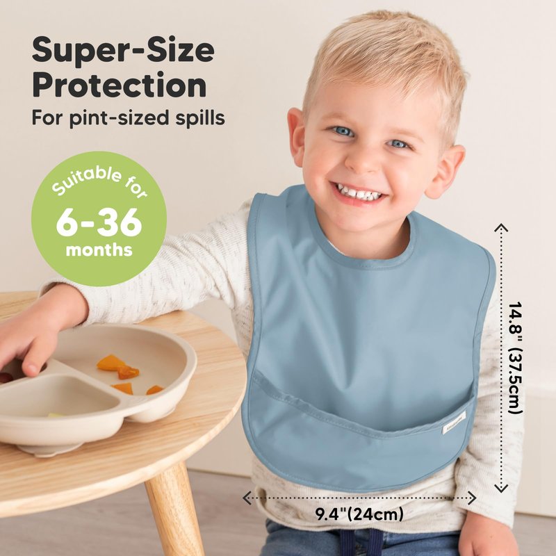 - Covers Upper Chest and Shoulders - Your baby can now enjoy self-feeding without soiling their clothes with the mess-proof bibs. This toddler bib for baby boys and girls comes with a wide food catcher pocket holds fallen food crumbs and purée spills.
