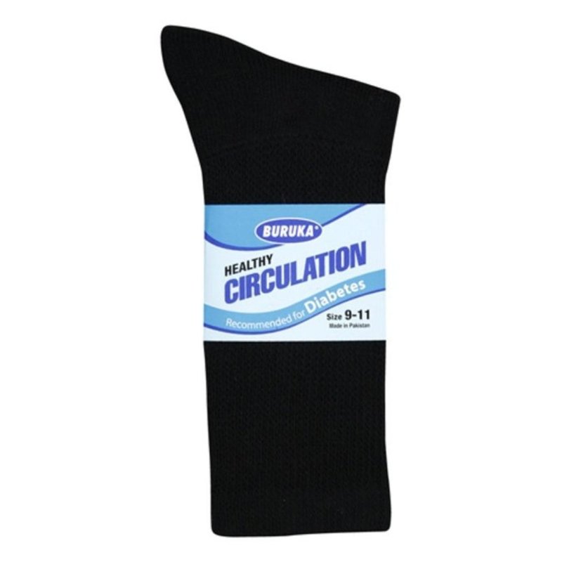 Buruka Men's White Diabetic crew socks are made from 88% cotton 10 % Nylon and 2 % Elastic . They are made for those with Diabetes , Edema and Swollen Feet. It provides neuropathy comfort support and better circulation. Not only that these socks aid in your health needs but the cushioning along the bottom provides additional comfort. Retail in pack of 3 pairs.****PLEASE NOTE SOCK FIT A BIT SNUG*** **SIZES 9-11 FITS SHOES 8-10** **SIZES 10-13 FITS SHOES 10-12** comfortably.