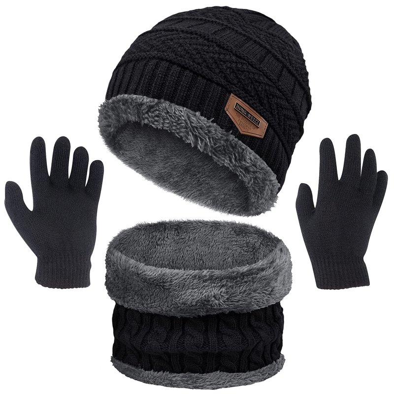 3 Pcs Boys Girls Winter Beanie Hat Scarf Gloves Set Thick Knitted Warm Toddler Winter Hat Mittens Neck Warmer for Kids, Black