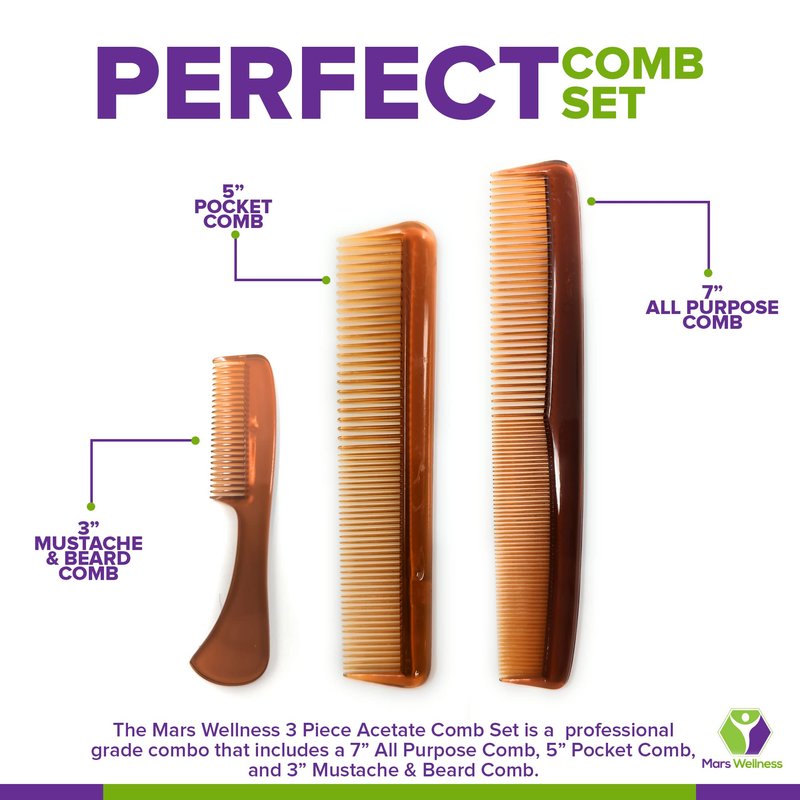 - THE PERFECT COMB KIT - The Mars Wellness 3 Piece Acetate Comb Set is a professional grade combo that includes a 7” All Purpose Comb, 5” Pocket Comb, and 3” Mustache & Beard Comb.