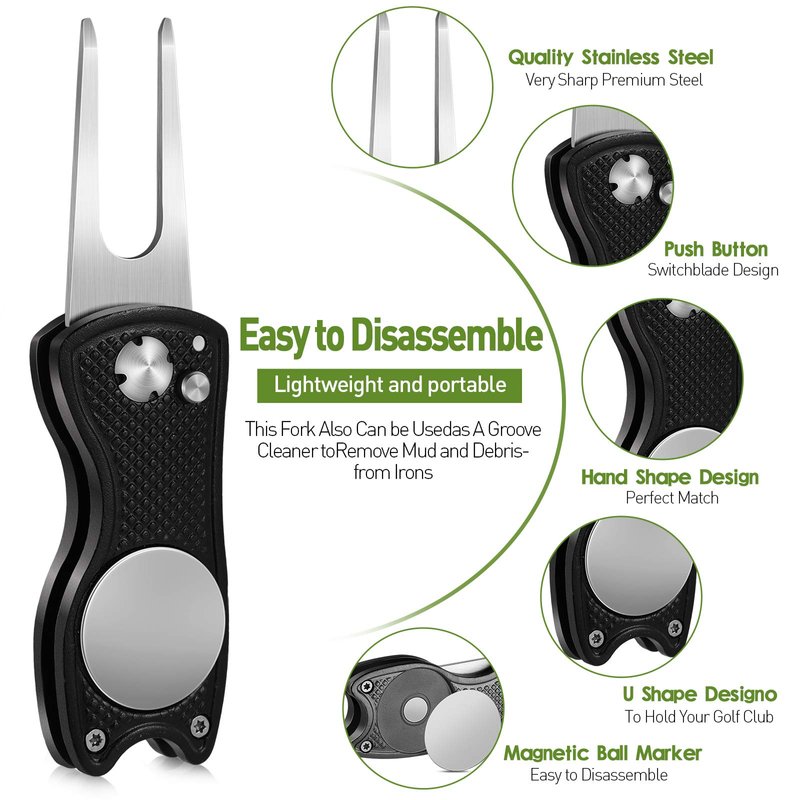 - Foldable and reliable: these magnetic golf pop up button tools are foldable that you just need to press the pop-up button and the tools will pop out, when not in use, you need to press and hold the switch for a few seconds to fold it back, reliable and convenient to use, effectively avoiding the pointed fork from scratching your pocket or fingers