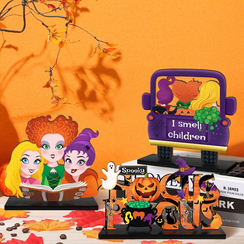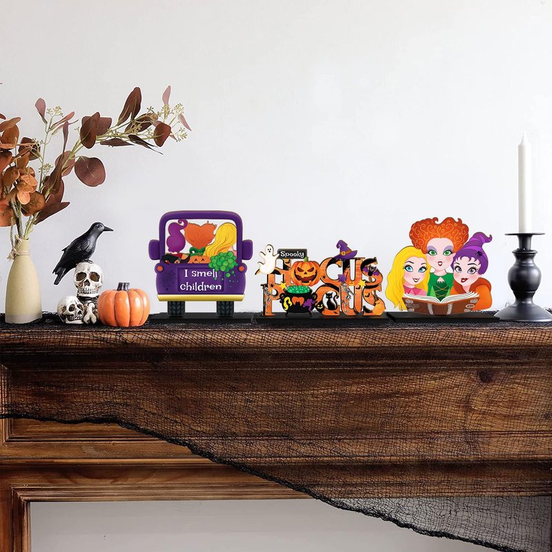 - ✦Package Content-- you will receive 3 pieces Hocus Pocus Halloween signs and 3 pieces black wooden base, the "HOCUS POCUS" text sign measures approx 7.9x4.3 inches, the purple truck sign measuring 5.9x5.9 inches, the witch sisters sign measuring 6x5.5 inches, approx. 0.16 inches in thickness. Sufficient quantity and suitable size to decorate your dining tables or windowsills, fireplace, creating a delicate and charming holiday atmosphere.