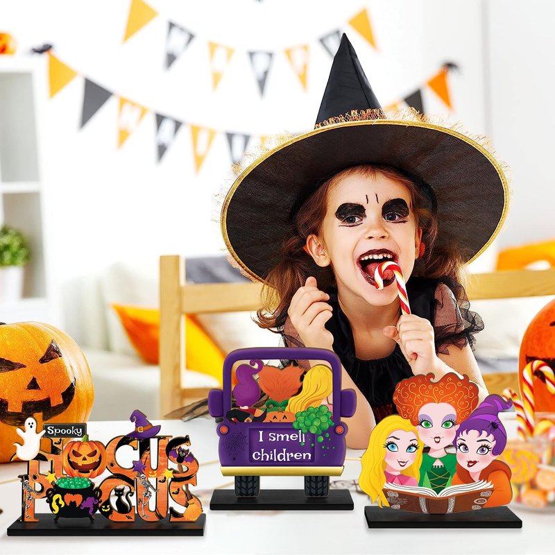 3 Pieces Hocus Pocus Halloween Table Sign Decorations, Halloween Witch Sisters Wooden Centerpiece Table Signs Truck I Smell Children for Kitchen Home Halloween Party Supplies