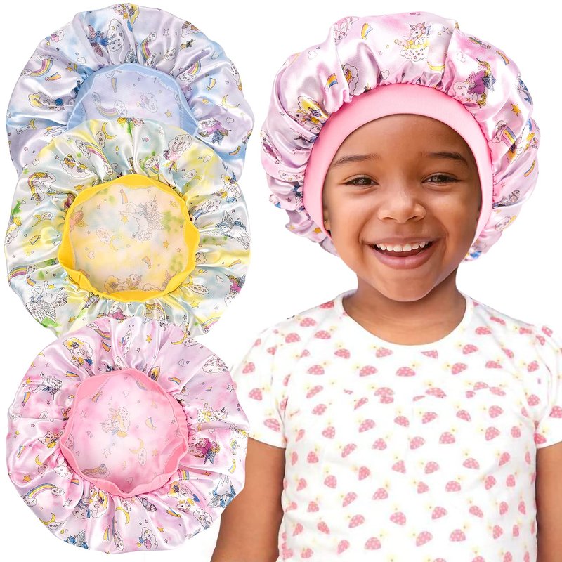 3 Pieces Kids Unicorn Satin Bonnet Wide Elastic Band Sleeping Cap Soft Silk Double Layer Night Hair Hats for Teens Toddler Child Baby
