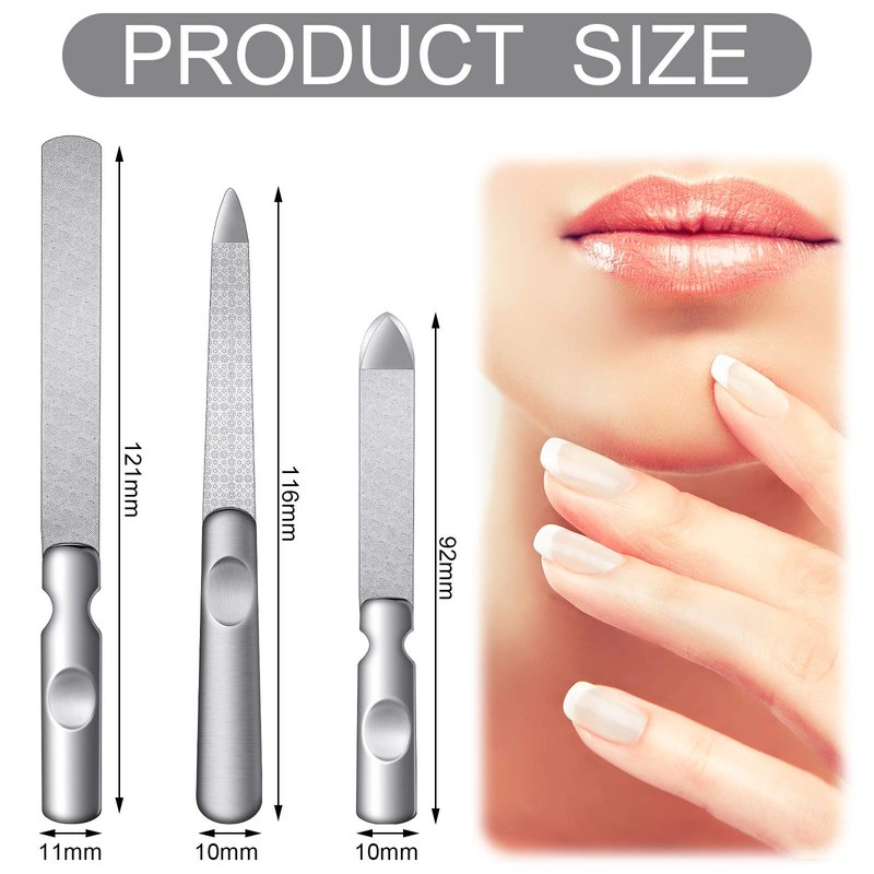 - Varied in dimensions: our stainless steel nail file buffers contain 3 various sizes, nail files with pointed head are approx. 116 x 10 mm/ 4.6 x 0.39 inches and approx. 92 x 10 mm/ 3.6 x 0.39 inches respectively, the nail file with round head is approx. 121 x 11 mm/ 4.76 x 0.43 inches, diverse dimensions can meet your diverse manicure purposes
