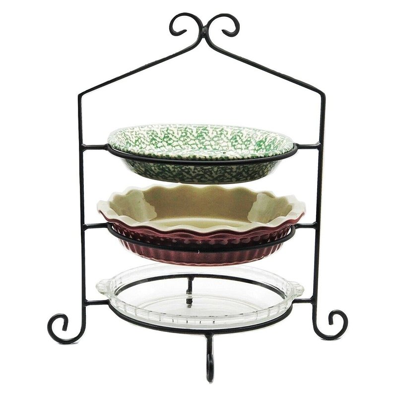 3-Tier WROUGHT IRON PIE PLATE STAND - Amish Blacksmith hand forged solid metal display. Beautiful Satin Black finish. Create a simple, yet classic and elegant accent to your kitchen with our three tier, triple pie plate stand. This primitive rack holds 10-12" pie plates and is also a great way to display your pottery pie plates and holiday decor. Measures 16½"w x 12"d x 17½"h. Inner Ring Measures 9¼". Handcrafted in Lancaster Pennsylvania USA. Made in the U.S.A.