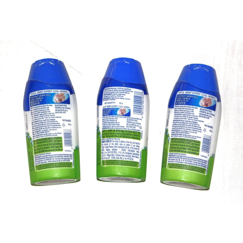 - - Stay fresh and comfortable all day with Nycil Cool Herbal Talcum Powder - Pack of 3 bottles, each containing 50g of refreshing talcum powder - Infused with herbal extracts for a burst of coolness and revitalization - Effectively absorbs excess moisture to keep you dry and sweat-free - Gentle formula suitable for all skin types, perfect for the whole family - Ideal for hot and humid weather conditions - Compact size makes it easy to carry in your bag or pocket for on-the-go freshness