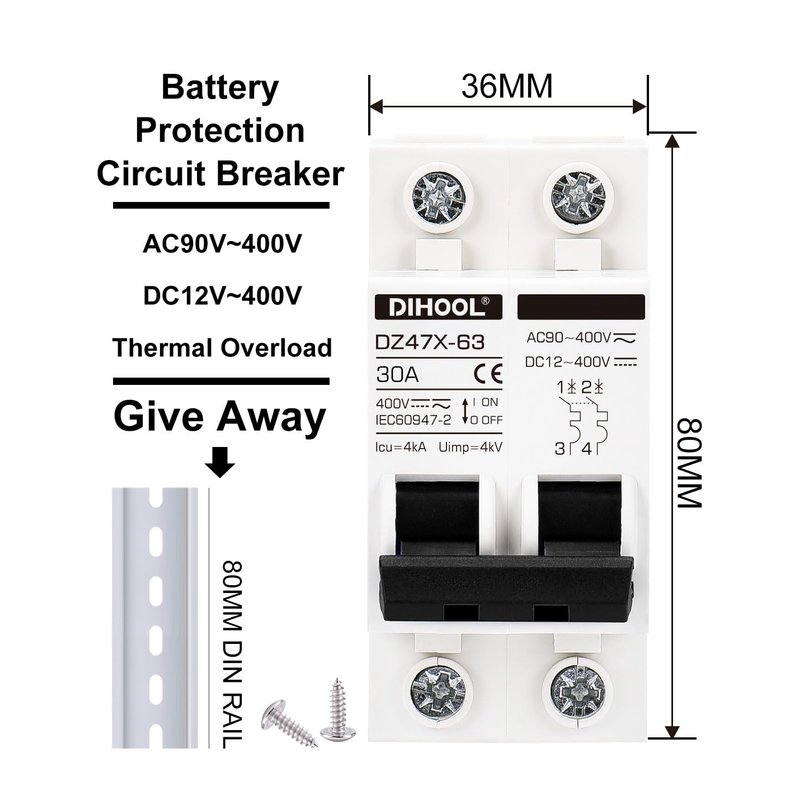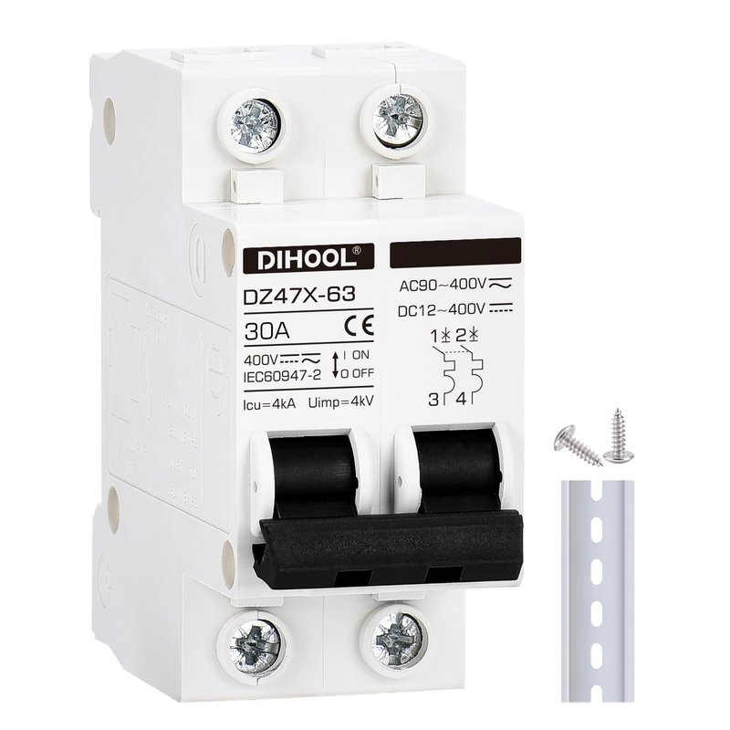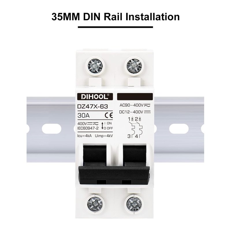 30 Amp 12V-400V AC DC Miniature Circuit Breakers (10A 15A 20A 25A 40A 50A 60A Optional) for Solar Panel PV System - Disconnect Switch, AC 110V DIN Rail MCB
