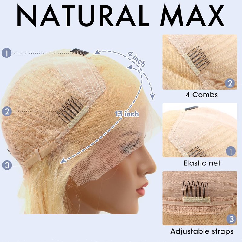 - Blonde Lace Front Wigs Human Hair Cap Size: The cap size of 13x4 lace front wigs human hair is 22-22.5 inch, fit most people, with 4 combs and 2 adjustable straps, easy to install and adjust, you can adjust the elastic band to fit your head and wrap it tightly, friendly for beginners.