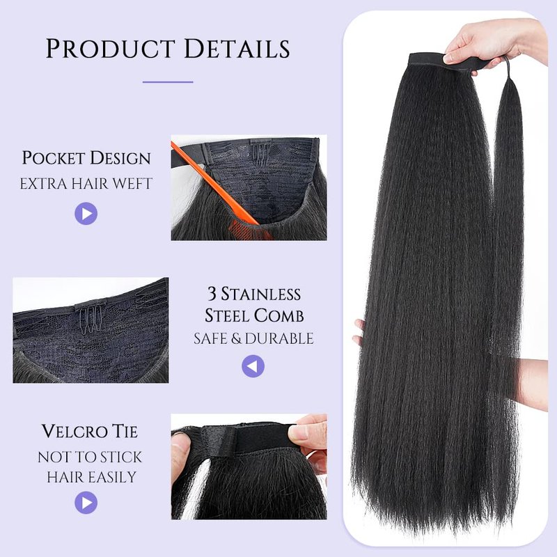 30 Inch Kinky Straight Ponytail Extension, Soft & Natural as Human Hair, Wrap Around Ponytail Extension for Black Women, Long Italian Yaki Synthetic Hair Extension, Natural Black(1B)
