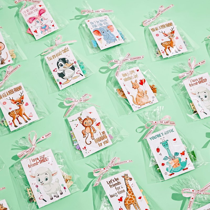 - šćVALENTINE'S DAY BLOCKS PACKAGEć: Valentine's Day gifts for kids package includes 30 animals blocks (10 kinds), 30 Valentine's Day cards,30 ribbons and 30 bags, the blocks are brightly colored and the animals spelled out are vivid and graphic.