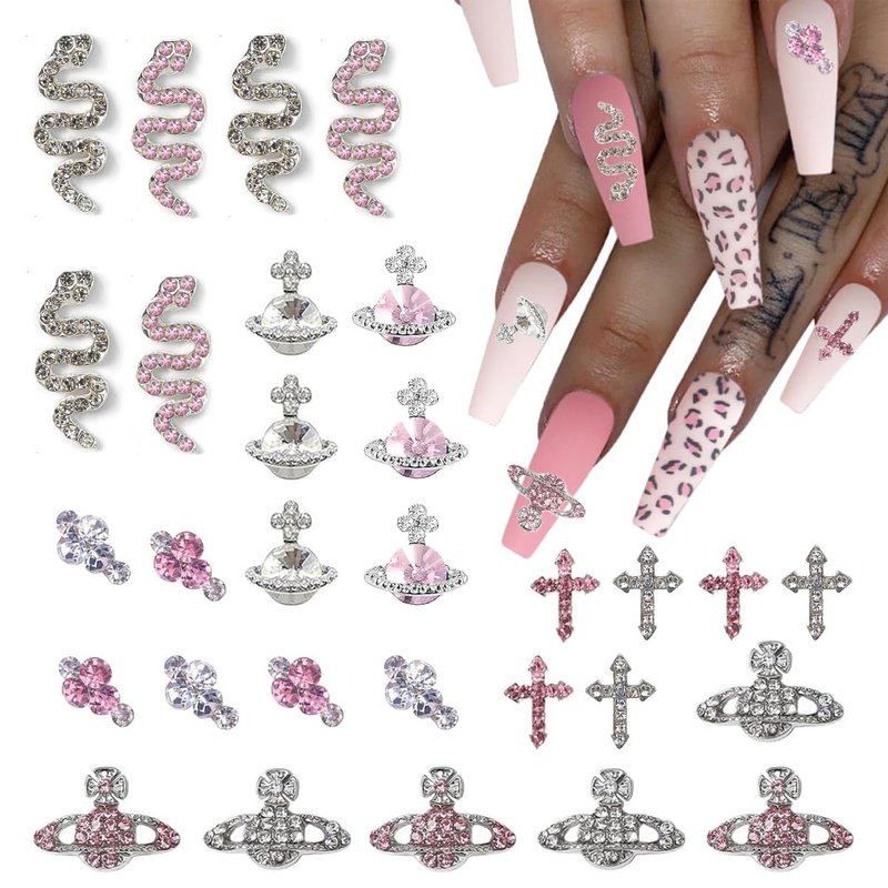 30 Pcs Nail Charms Pink Y2k Chrome Nail Art Rhinestone Charms 3D Cross Snake Saturn Shape with Rhinestones Planet Nail Gems Shiny Nail Jewelry Acrylic Nail Decorations Accessories Supplies