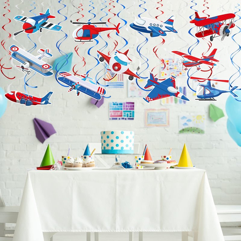 - Cute Airplane Design: the airplane party supplies set are designed with 11 different styles of airplanes, features vibrant color and double sided printing; After these aircraft models cutouts are suspended by spirals, they will float in the air like real planes, colorful and vivid; You can also use the airplane ceiling hanging swirls as shiny decoration props to take photos, satisfy children's aerospace dreams