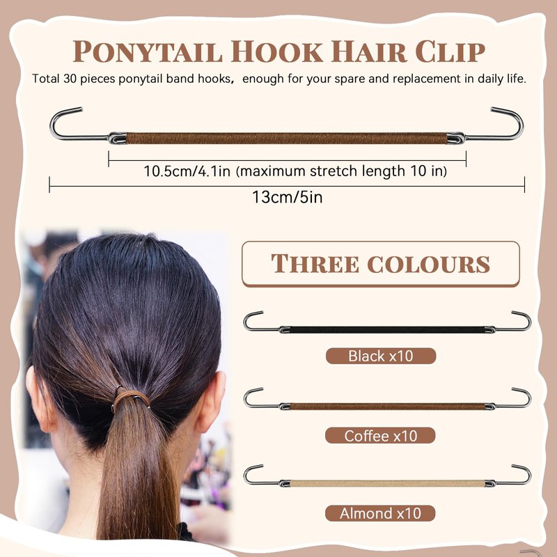 - 【Package Include】This set consists of 30 hair hooks for ponytails, available in black, brown, and apricot colors, 10 of each color, enough for you to change and spare in your daily life.