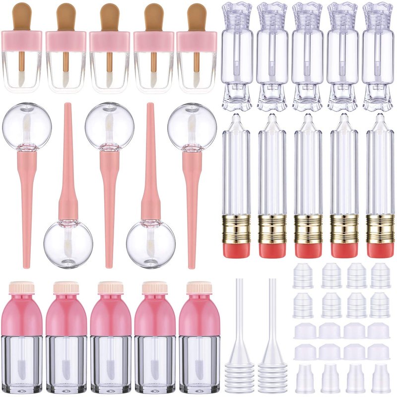 30 Pieces empty lip gloss tubes tool set, include 25 pencil ice-cream lollipop bottle candy shaped empty lip gloss bottle refillable lip balm containers and 5 plastic funnels for women girls DIYFeatures: Plastic funnels offered: Apart from novelty lip oil bottles, there are 5 pieces funnels in this package, which can help you fill the lip gloss tubes with liquids conveniently and reduce waste, as well as keep your lip oil clean. Thoughtful gifts: These refillable empty lip gloss tubes are cute and adorable which are ideal to serve as practical gifts for your friends, sisters, mom, family members, classmate and other female friends on birthday or holidays, can satisfy their different daily needs. Specifications: Material: plasticColor: as pictures show Quantity: 30 pieces Package includes: 5 x Ice-cream shaped empty lip gloss tube5 x Candy shaped lip gloss containers5 x Pencil shaped empty lip gloss tubes5 x Lollipop shaped lip gloss containers5 x Bottle shaped lip gloss tube5 x FunnelNote: The colors may exist slight difference due to different screens.