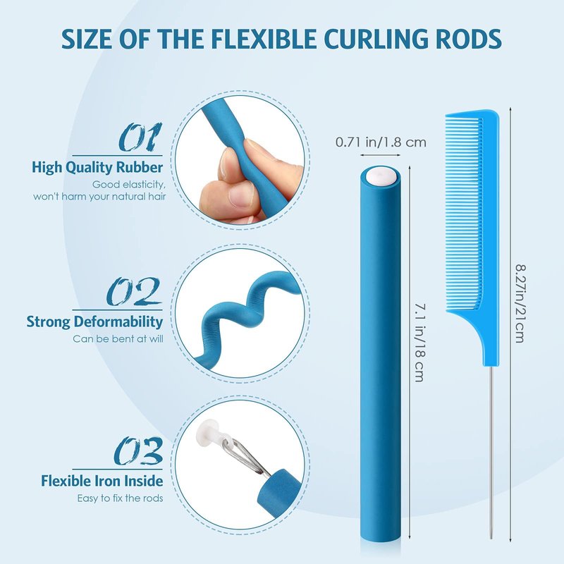 30 Pieces Flexible Curling Rods Twist Foam Hair Rollers Soft Foam No Heat Hair Rods Rollers and 1 Steel Pintail Comb Rat Tail Comb for Women Girls Long and Short Hair (Blue, 7 x 0.7 Inch)