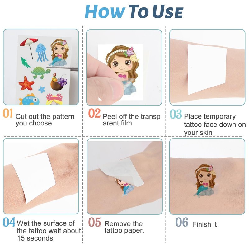 - 【Great Fun 】Great for all ages.will love the variety of playful mermaid more. A fun thing for mermaids-lovers! The kids temporary tattoos suitable for birthday parties, school rewards supplies, sea-themed parties, animal parties, cars parties, outdoor camping etc.