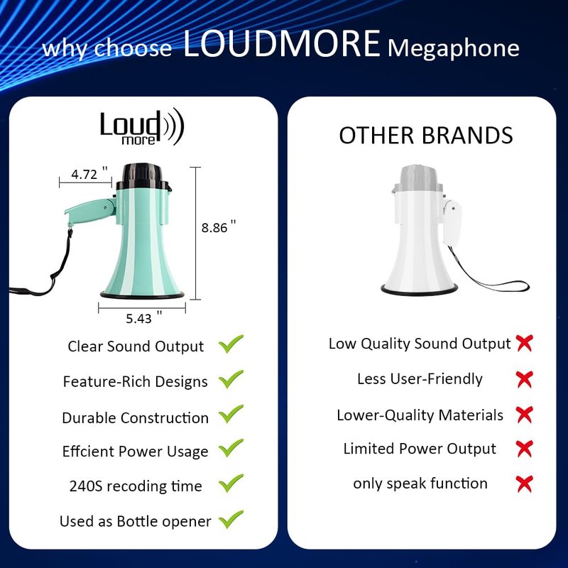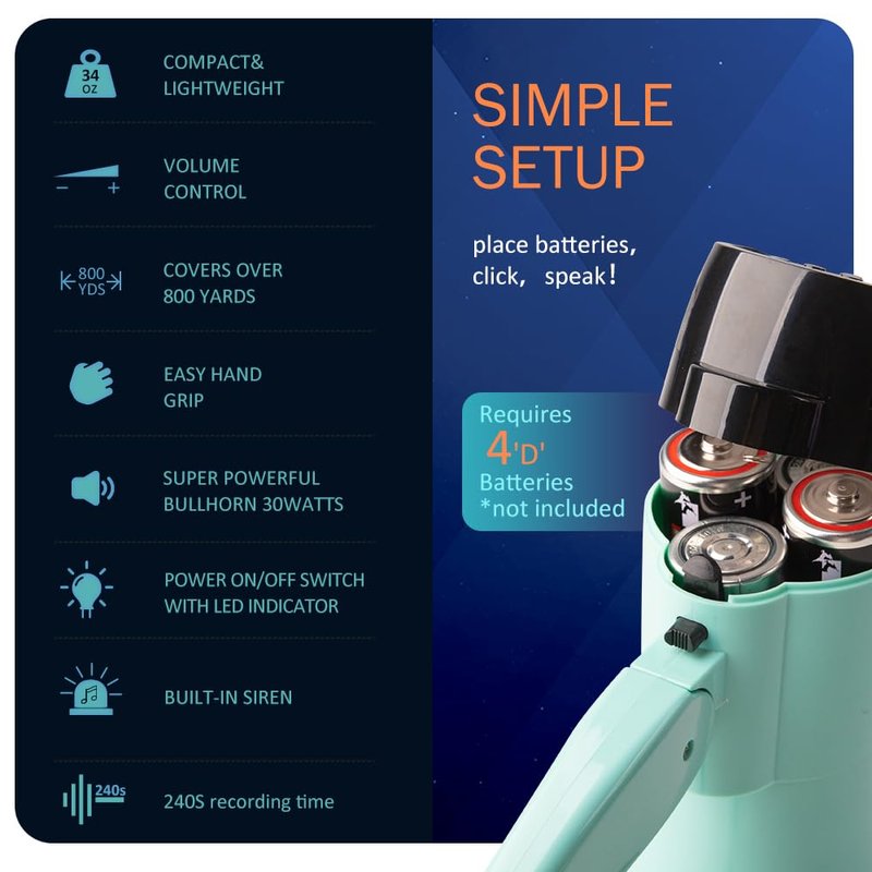 Loudmore 30 Watt Power Portable Megaphone Bullhorn Speaker Voice, Siren/Alarm and 240S Recording with Volume Control and Strap (Teal)