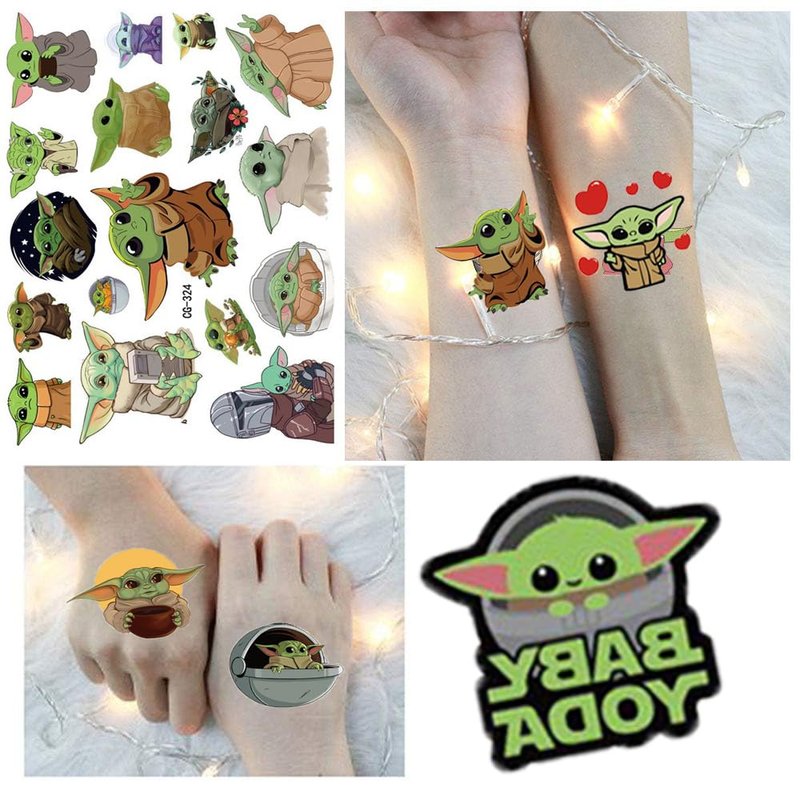 Product Description SPECIFICATIONS: Name:Baby Yoda temporary tattoos Designs: Yoda Color: As the picture shows Quantity: 4*4=16Sheets Multiple Use: Perfect for Baby Yoda Theme Birthday Party, cosplay dress-up accessories, photos, water bottle, mug decoration etc. FEATURE: -The best gift for your kids, friends, boy, girl. -Environmentally friendly materials for Kids. -Suitable for daily decoration. HOW TO USE: 1. Cut out tattoo of choice and remove clear sheet. 2. Place tattoo face downon skin. 3. Wet the tattoo thoroughly with a sponge. 4. After 20-30 seconds, gently remove the backing paper. 5. Allow the tattoo to dry. HOW TO REMOVE: Dab tattoo with rubbing alcohol or baby oil. wait 10 seconds, then rub gently and repeatedly with more rubbing alcohol or baby oil until removed. Warning: Discontinue use if irritation occurs! Do not put directly on eye! Not for children under 3 years!