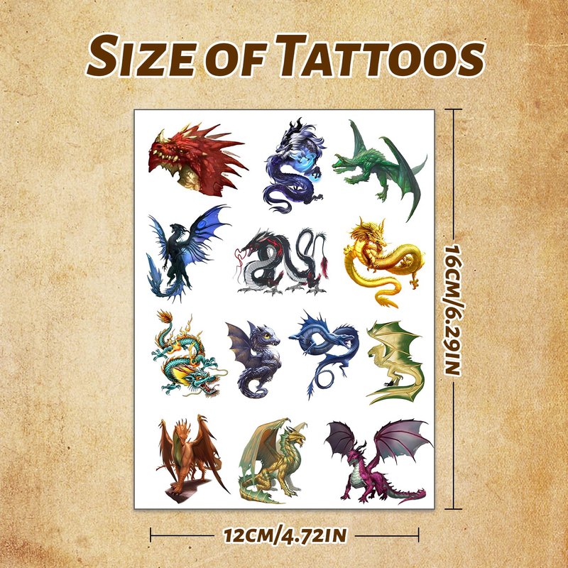 - 【Suitable Size for Party Supplies】: Dragon theme tattoo stickers measure about 12 x 16 cm/4.72 x 6.3 inches each, the size is very suitable for decorating your hands, arms, face, besides. Very cool tattoo stickers for kids who love dragon!