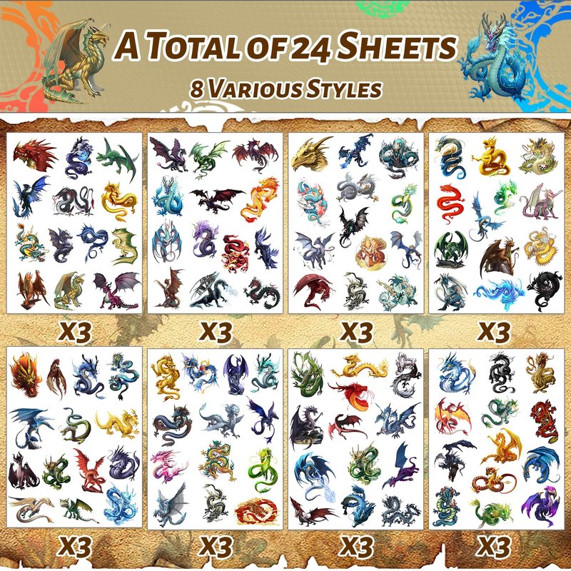 Our tattoos pack contains 24 sheet dragon temporary tattoos with 8 styles over 300+ tattoos. Each of our dragon temporary tattoos has a unique design to make your life brighter and funnier.