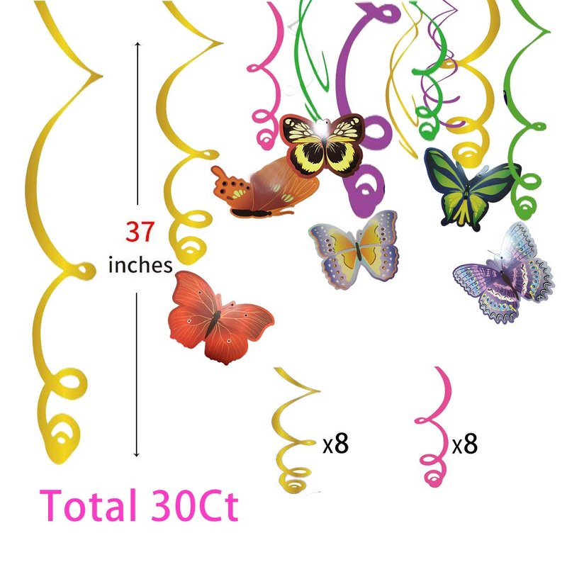 - Set of 30Ct Butterfly Decorations Hanging Swirl with Various Color Flying Butterflies hanging length 36-37 inches Long.