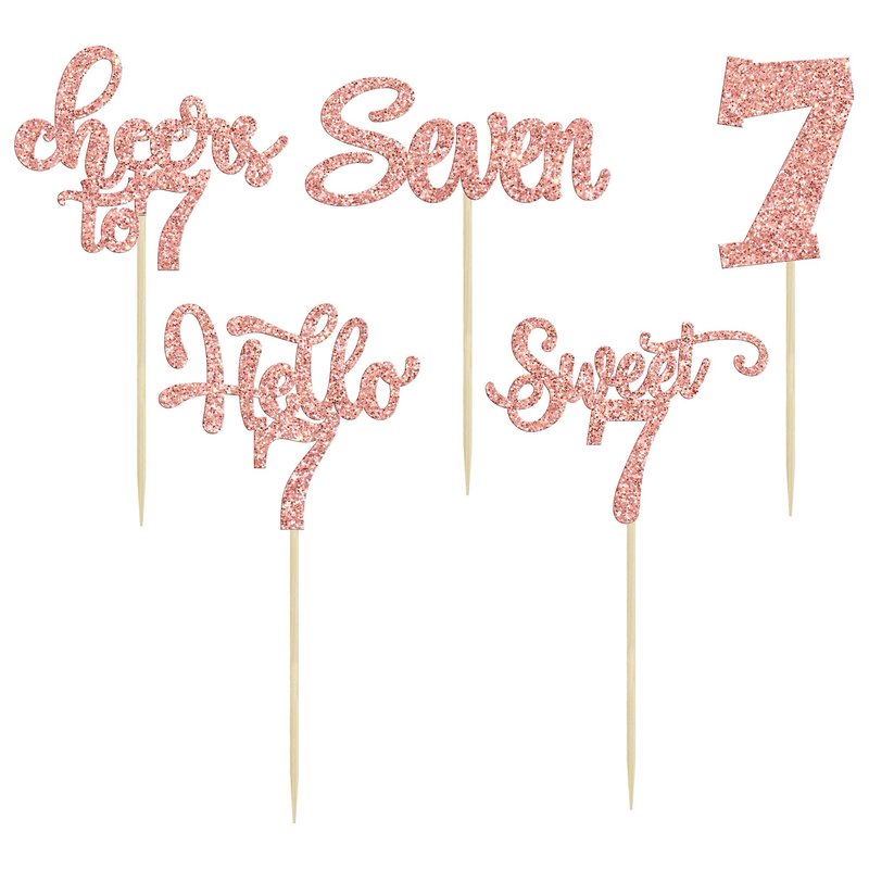 30Pcs 7th Birthday Cupcake Toppers Glitter Seven Happy 7 Cupcake Picks Cheers to 7 Years Old Cake Decorations for 7th Birthday Party Supplies Rose Gold